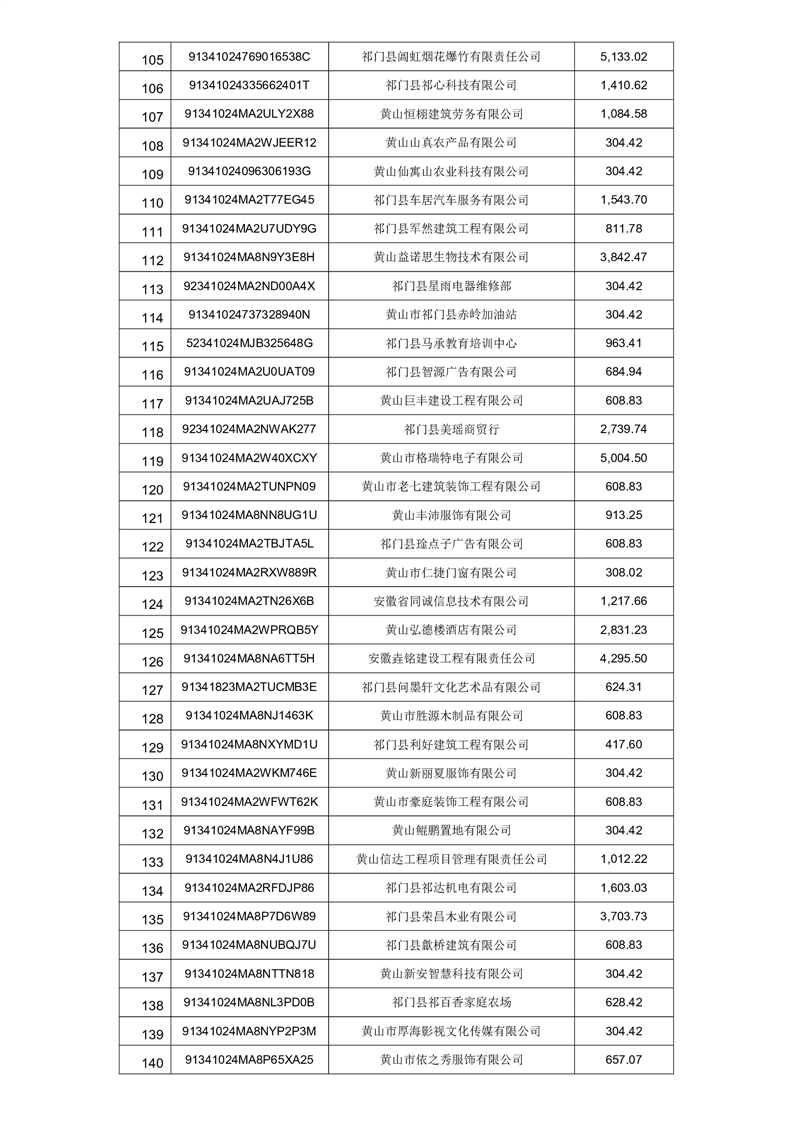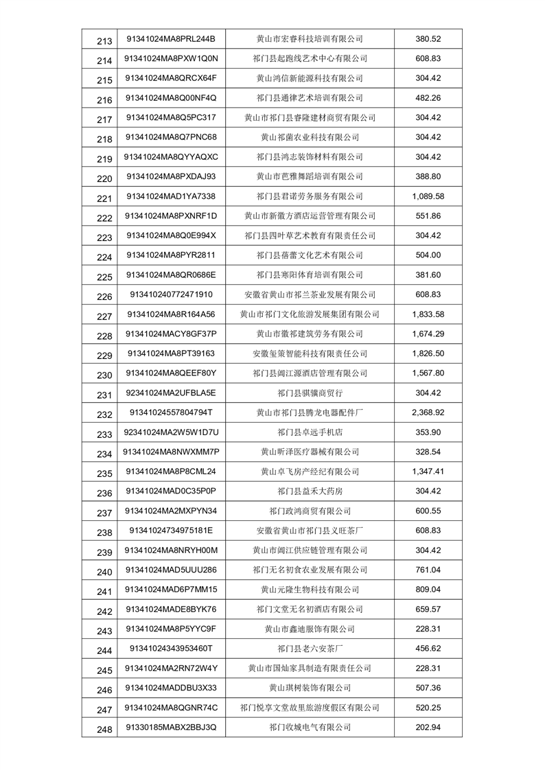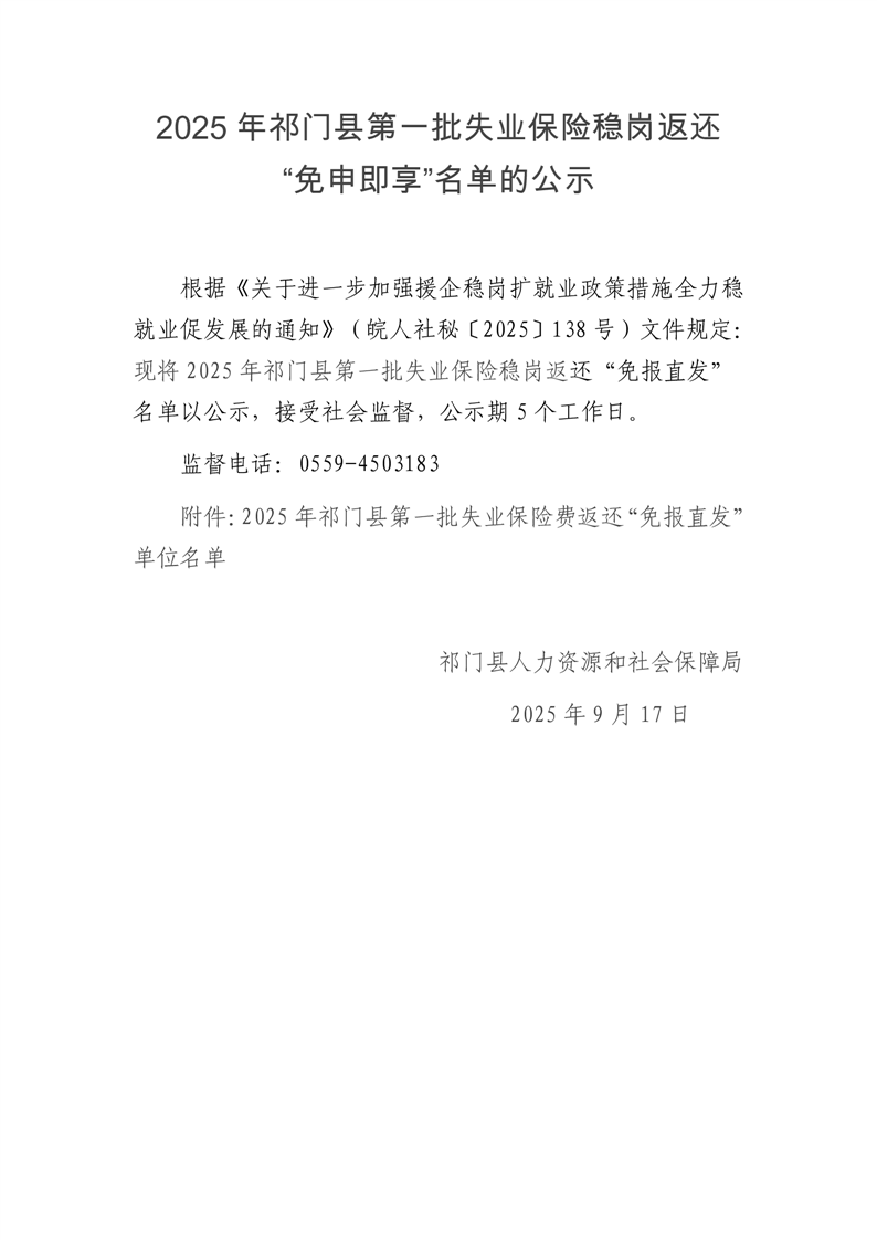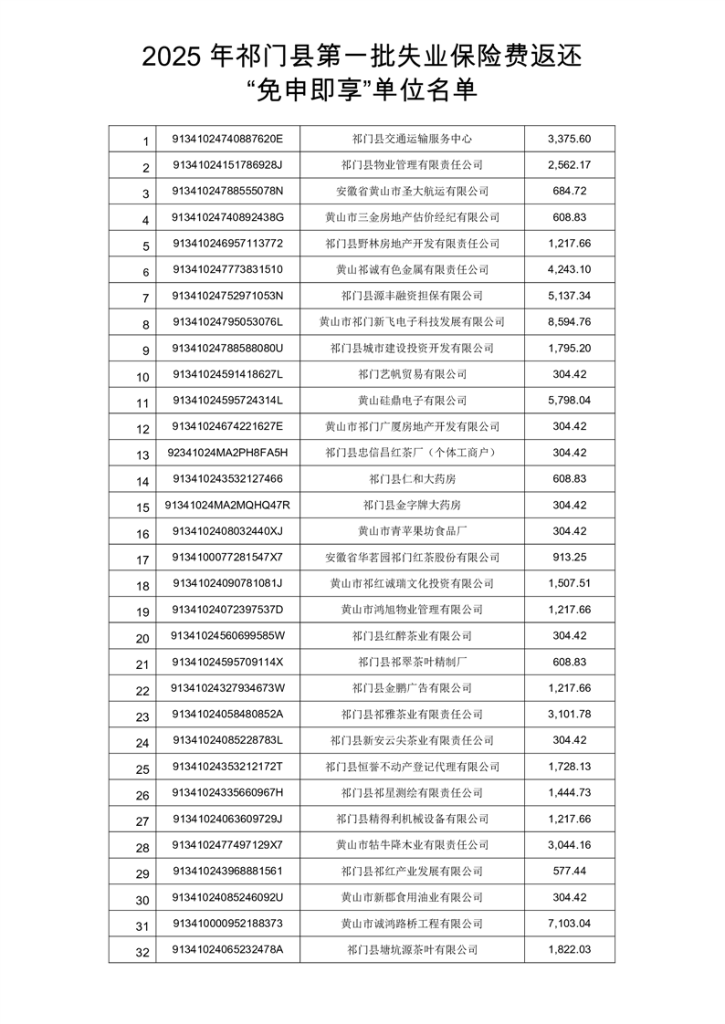 2025年祁门县第一批失业保险稳岗返还“免申即享”名单的公示