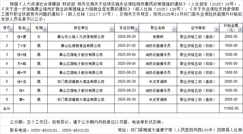 2025年10月祁门县失业保险技能提升补贴拟发放人员名单信息公示