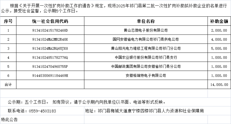 关于2025年黄山市祁门县第二批一次性扩岗补助拟补助企业名单的公示