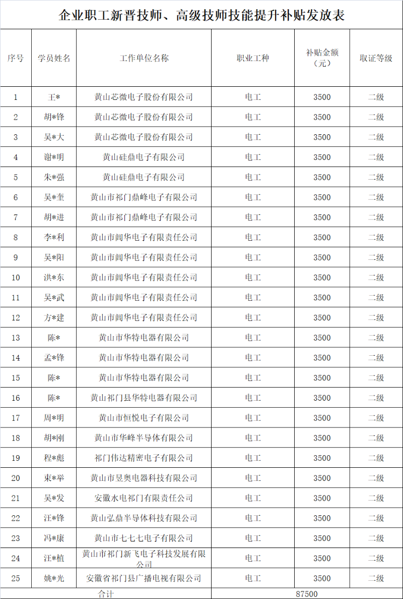 企业职工新晋技师、高级技师技能提升补贴发放表(2025.11.27)