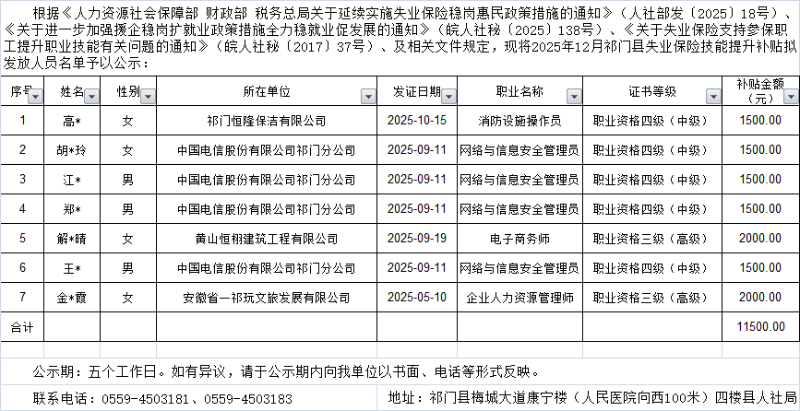 2025年12月祁门县失业保险技能提升补贴拟发放人员名单信息公示