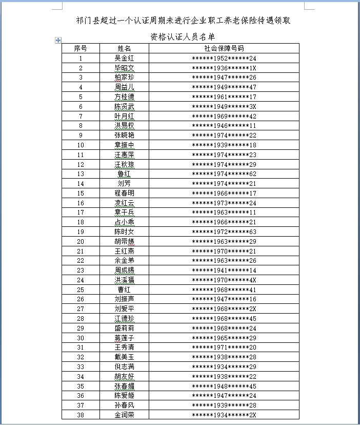 附:祁门县超过一个认证周期未进行企业职工养老保险待遇领取资格认证人员名单