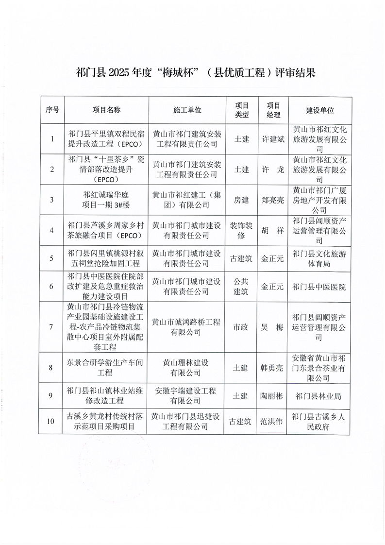 关于2025年度祁门县建设工程“梅城杯”奖(县优质工程)评审结果的公示
