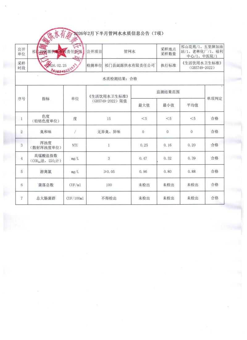 2026年2月下半月管网水水质信息公告(7项)