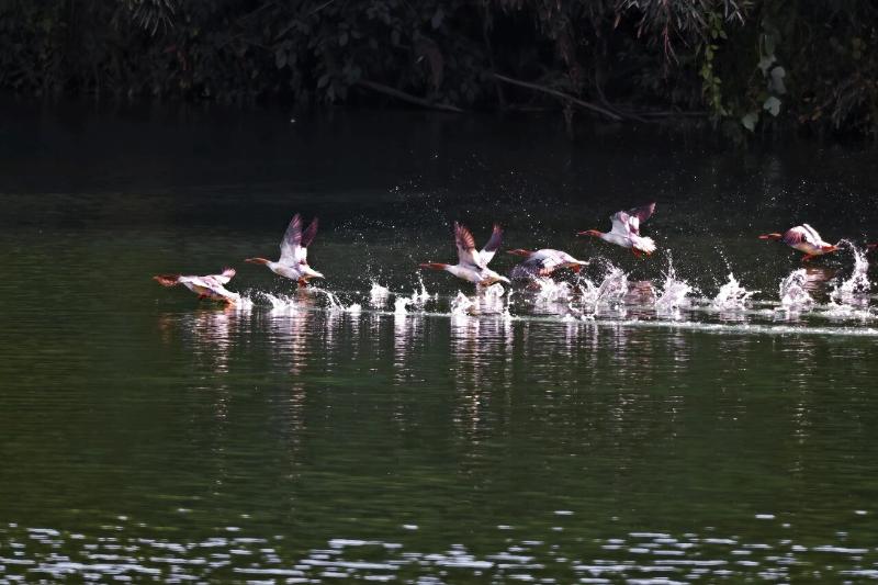 冬日里的阊江,青山环抱,碧水悠悠。成群结队的中华秋沙鸭像跳动的音符,点缀在碧波之上,时而在河面上追赶觅食,时而在岩石上小憩,时而梳理着美丽的羽毛,恣意享受大自然的风光,勾勒出一幅山水静好、飞鸟翔集的美丽生态画卷。