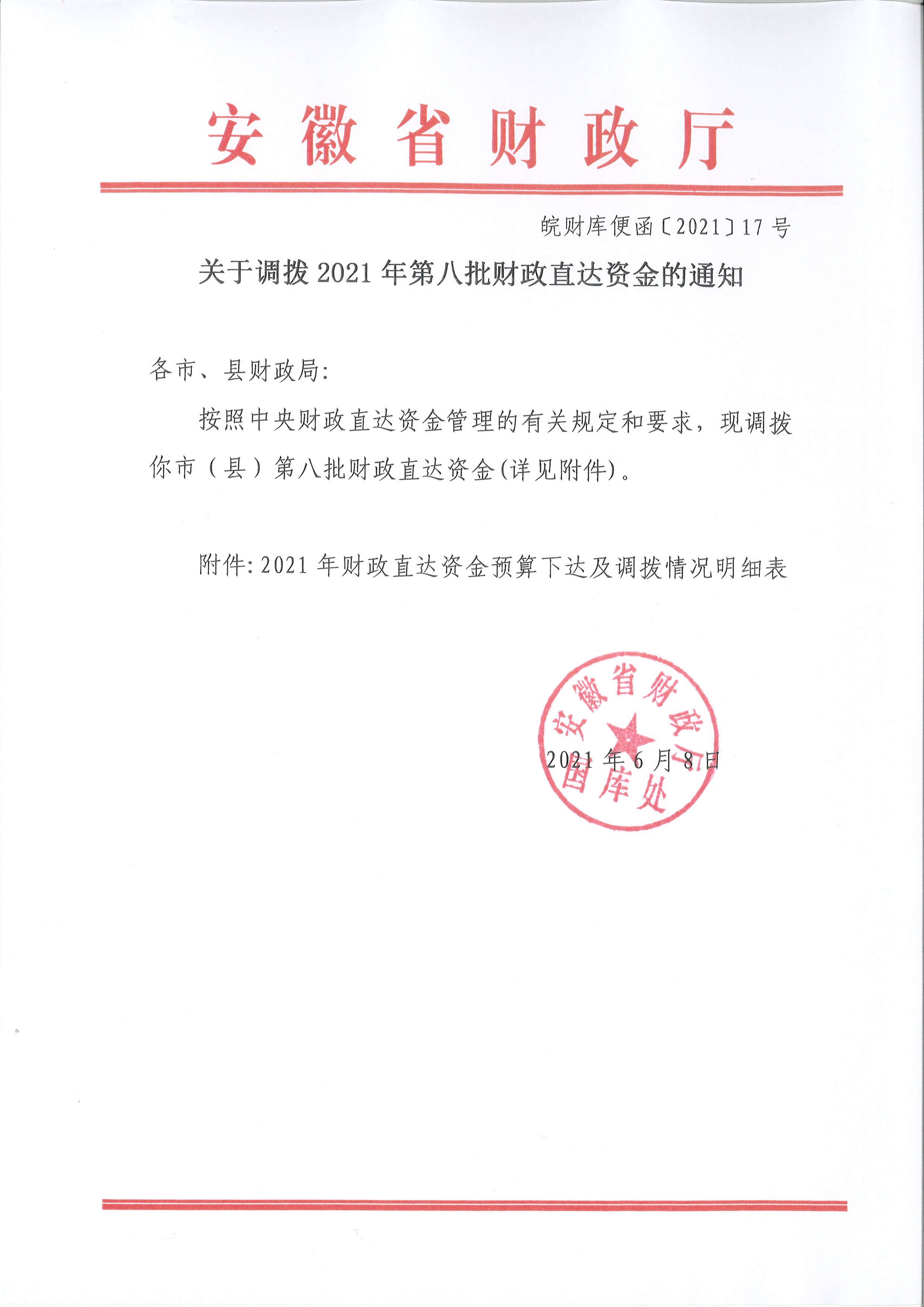 【财政资金直达基层】关于调拨2021年第八批财政直达资金的通知