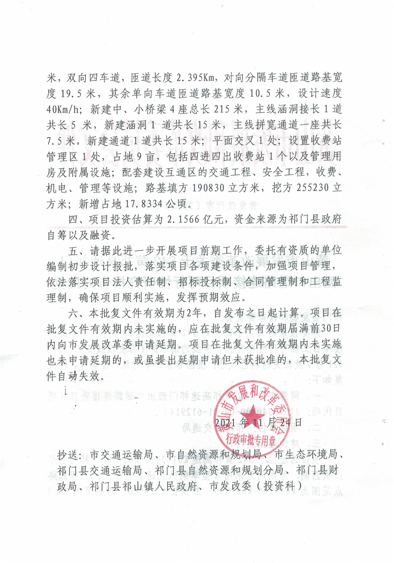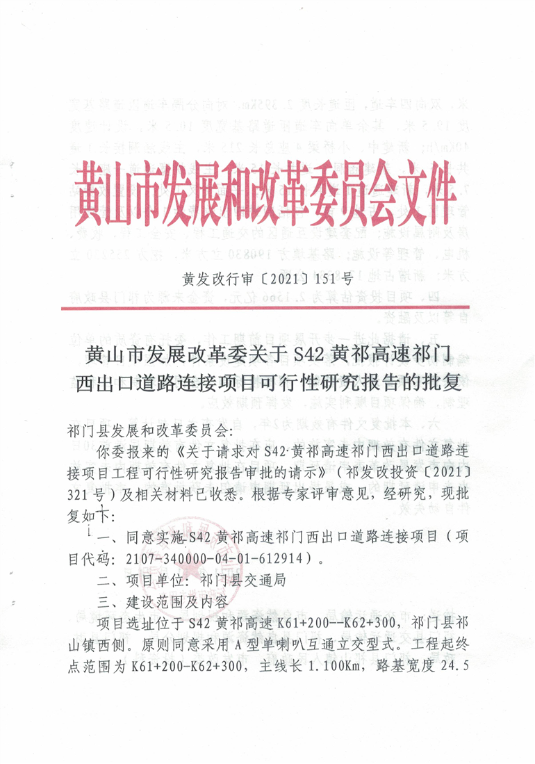 【可行性研究报告】黄山市发展改革委关于S42黄祁高速祁门西出口道路连接项目可行性研究报告的批复