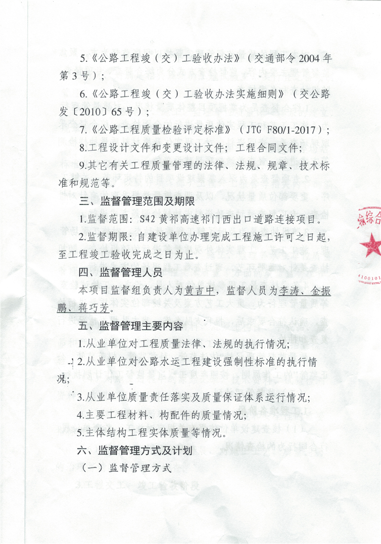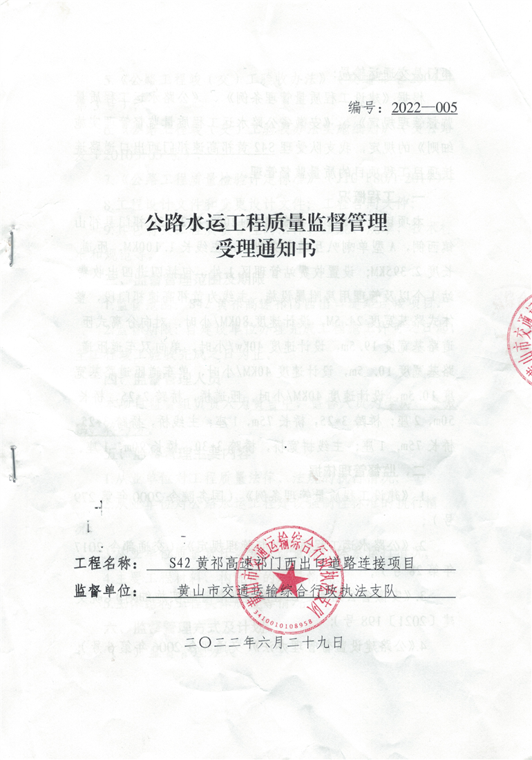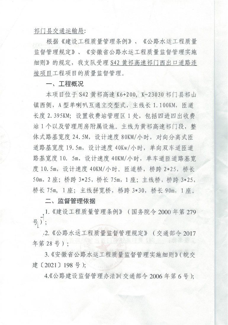 【质量安全监督信息】 S42黄祁高速祁门西出口道路连接项目