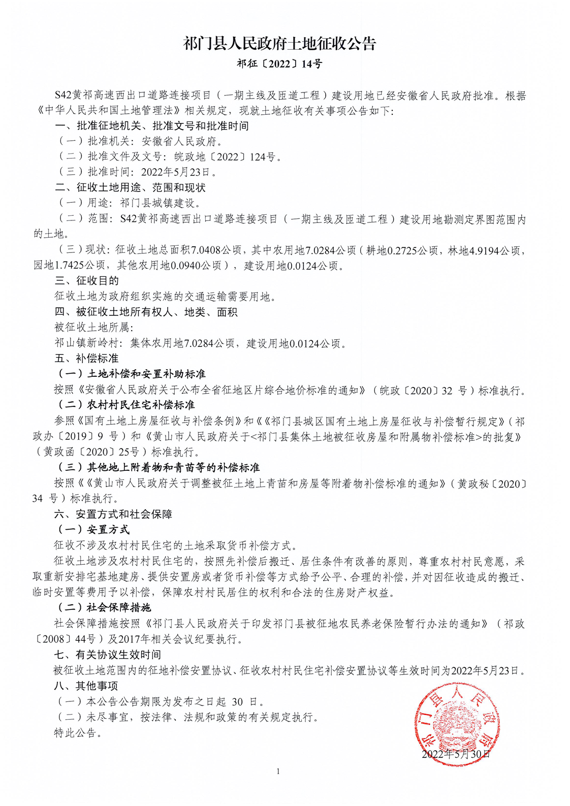 【土地征收公告】 S42黄祁高速祁门西出口道路连接项目(祁征【2022】14号)