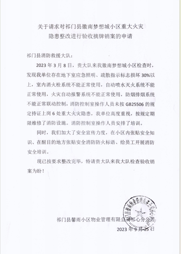 祁门县徽南梦想城小区重大火灾隐患销案申请