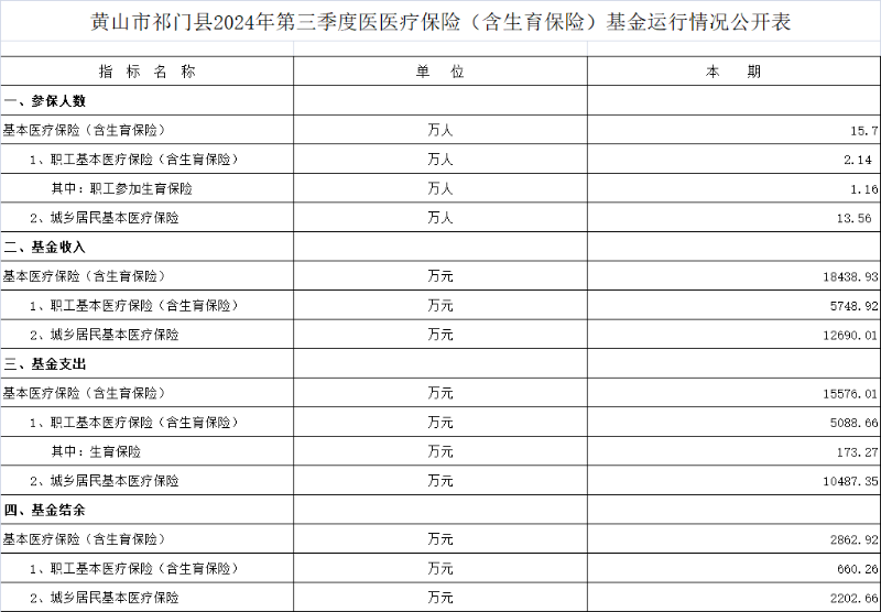 黄山市祁门县2024年第三季度医医疗保险(含生育保险)基金运行情况公开表