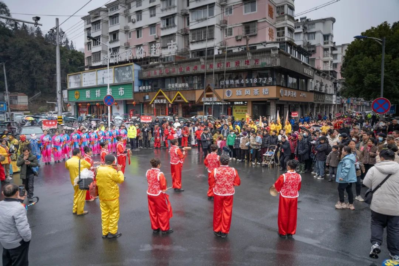 “咚咚锵、咚咚锵”,锣鼓喧天、器乐合鸣,下午一时许,熙熙攘攘的街道热闹非凡,元宵节的喜庆欢乐气氛蔓延开。目连戏、傩舞、采茶扑蝶舞、十番锣鼓、打莲湘、徽州腰鼓等祁门县非遗队伍沿着街道给市民送欢乐送祝福,他们身着多姿多彩的古装,手持独特的道具,向市民们展示着非遗的独特魅力,传播着中华优秀传统文化。
