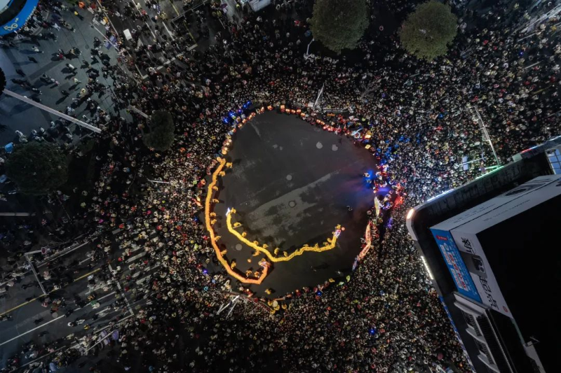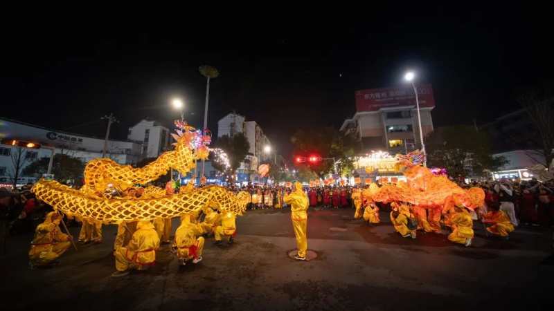 祁门县城中心路口处,两条龙在此汇合,双龙首尾相衔,盘桓缠绕,龙身上的彩灯熠熠生辉,鼓点急而骤,龙身腾挪,彩球高悬,双龙戏珠。花灯队伍也蜂拥而至与双龙共同舞动“梅城”。此时万人空巷,祁门县城呈现一片欢乐的海洋。