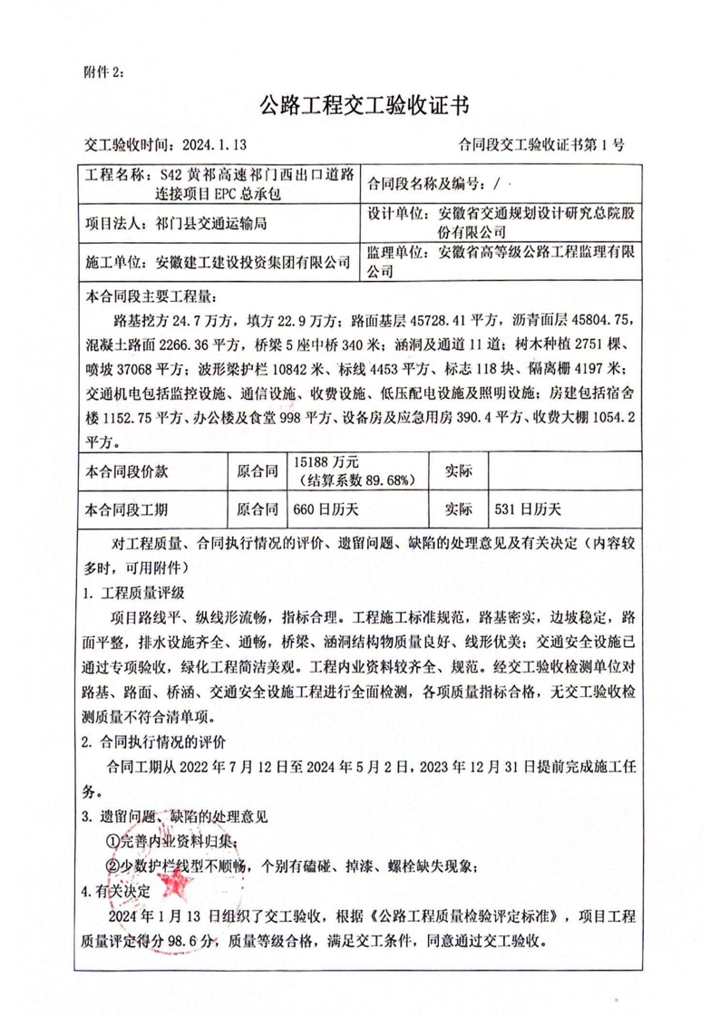 关于S42黄祁高速祁门西出口道路连接项目交工验收报告