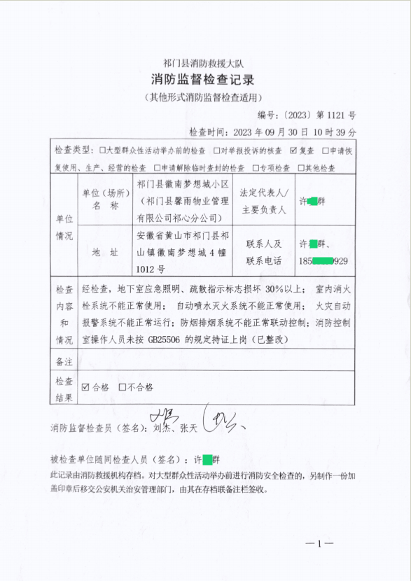 县消防大队对徽南梦想城小区重大火灾隐患整改情况进行复查确认