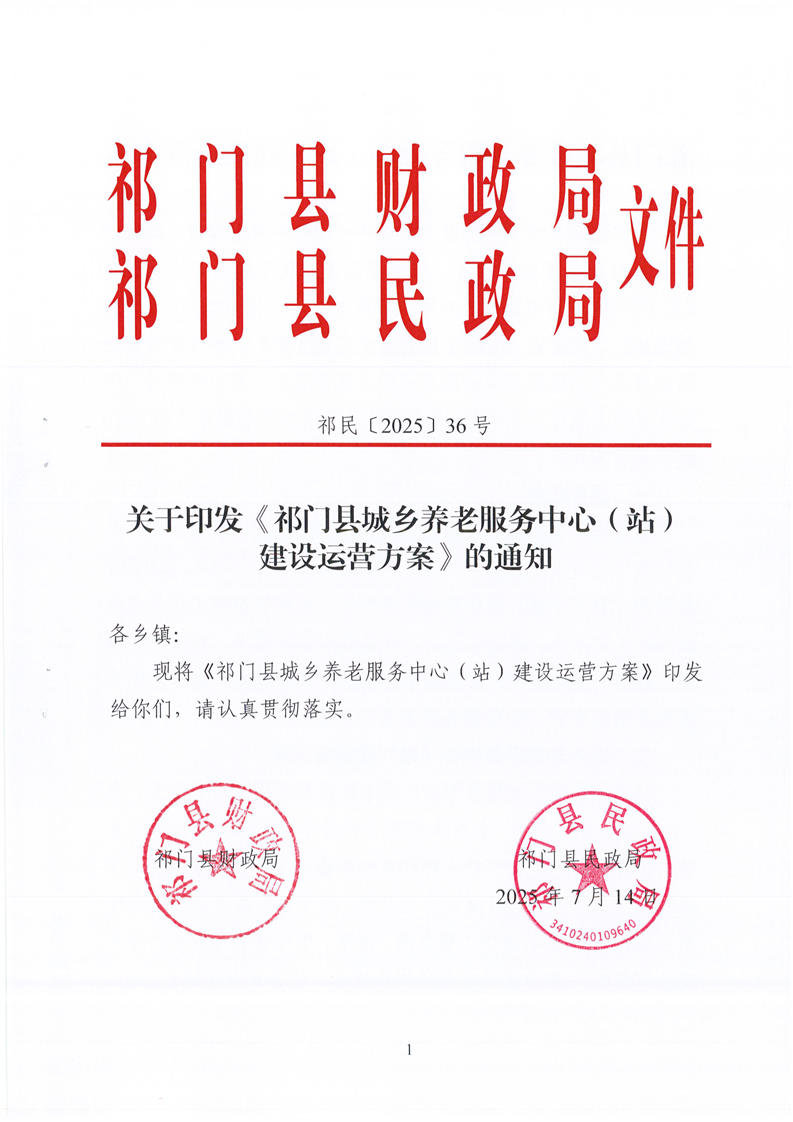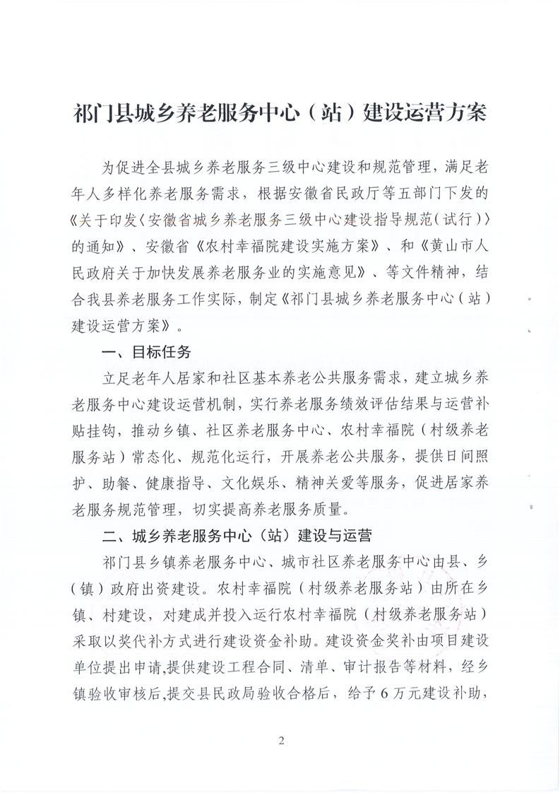 关于印发《祁门县城乡养老服务中心(站)建设运营方案》的通知