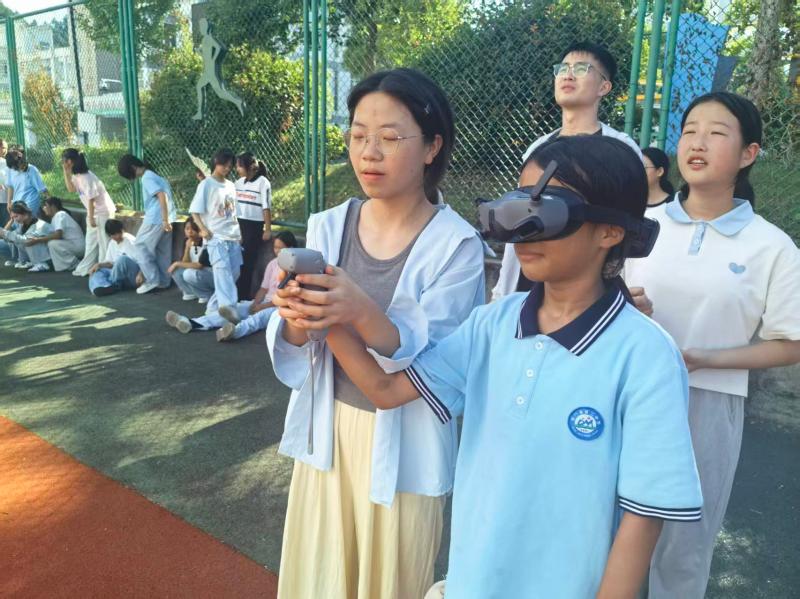 活动分为上下两场,上半场为无人机原理讲解及环保、抢险、战争等无人机应用场景介绍,并室内进行了远程控制无人机启航,巡航、返航展示。下半场来到操场,在孙昕等三位专业教师指导下进行实操,学生头戴第一视角眼镜“身临其境”,手持“穿越机遥控器”,通过摇杆精准调节无人机油门、方向与飞行姿态,分组挑战穿越多维障碍空间、空中翻滚、漂移、急停等操作。同学们踊跃参与,在成功完成操作时发出阵阵欢呼。八年级学生余秀妍表示:第一次操控无人机完成特技,体验非常新奇,感觉自己就像“云端指挥官”。