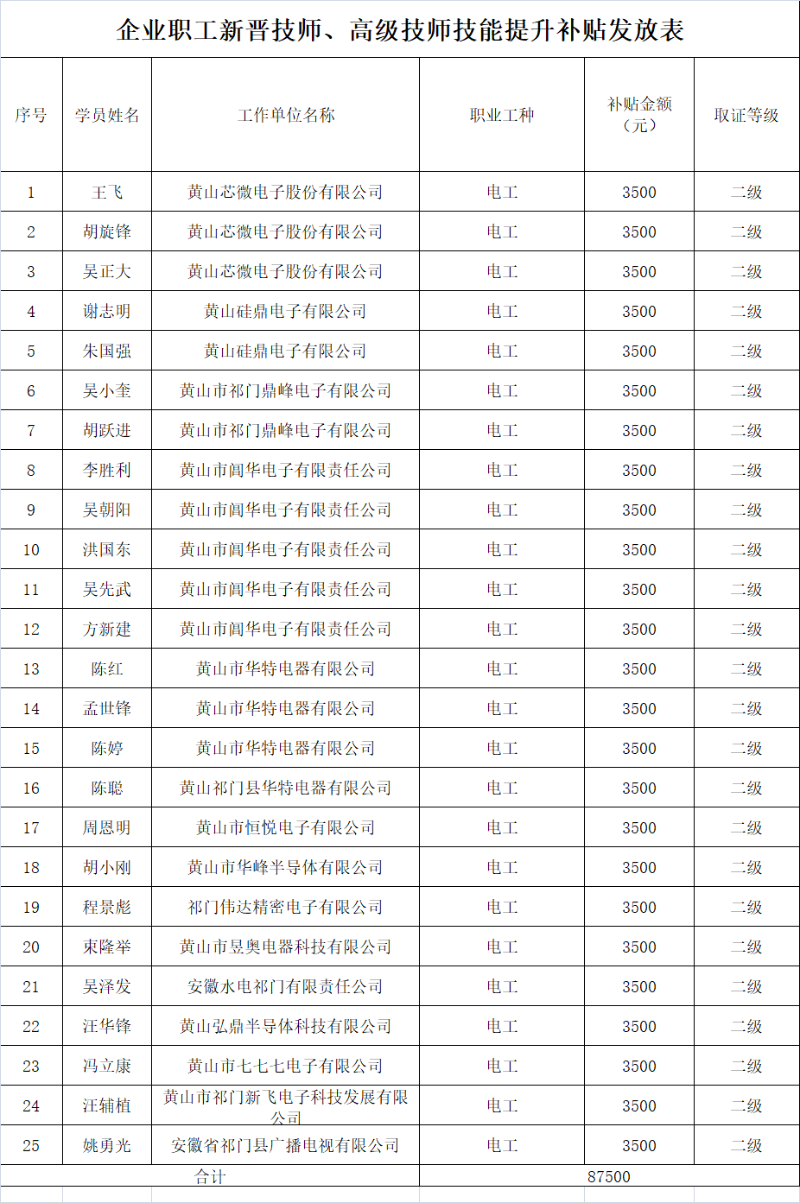 企业职工新晋技师、高级技师技能提升补贴发放表(2025.11.27)