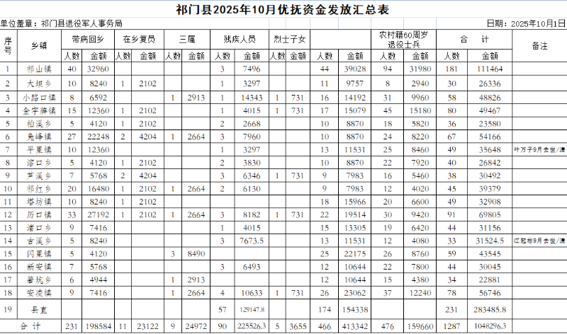祁门县2025年10月优抚资金发放汇总表