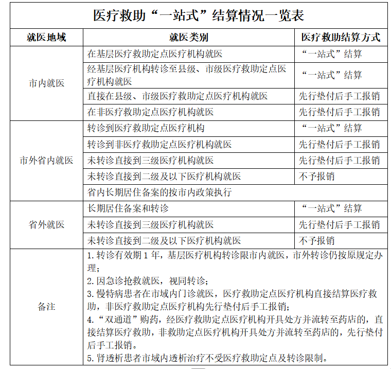 在基层医疗救助定点医疗机构就诊和经基层首诊、转诊到市域内医疗救助定点医疗机构就诊的,可享受基本医保、大病保险和医疗救助在医疗机构“一站式”结算,医疗救助对象仅需支付个人自付费用;不能“一站式”结算的医疗救助费用,需患者先行垫付后办理手工报销。