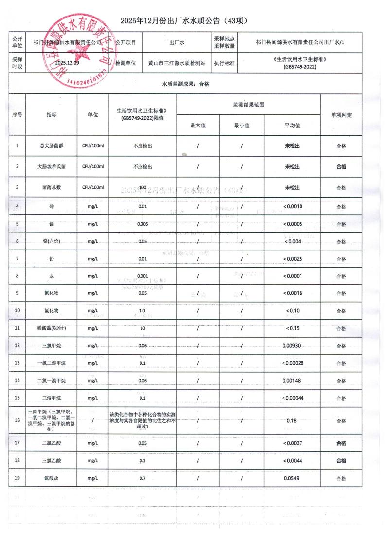 【主动回应】2025年12月份出厂水水质公告(43项)