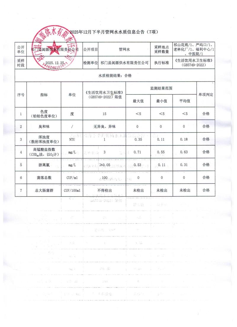 【主动回应】2025年12月下半月管网水水质信息公告(7项)