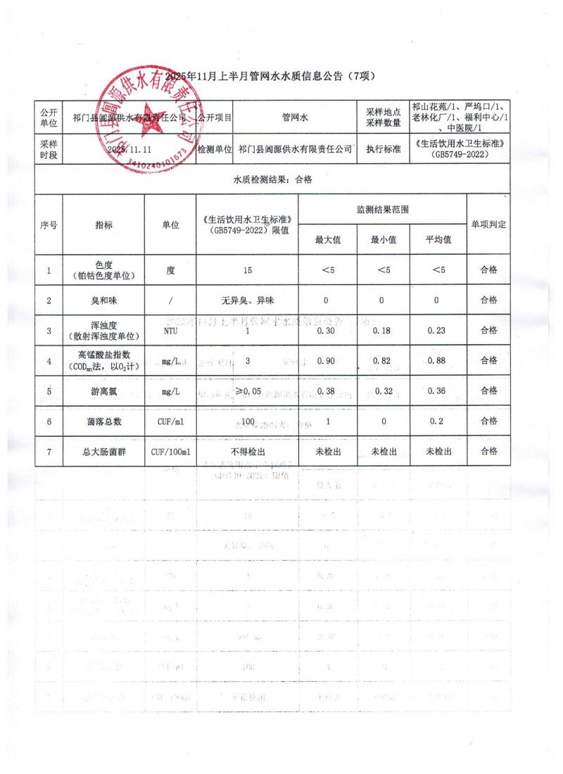 【主动回应】2025年11月上半月管网水水质信息公告(7项)