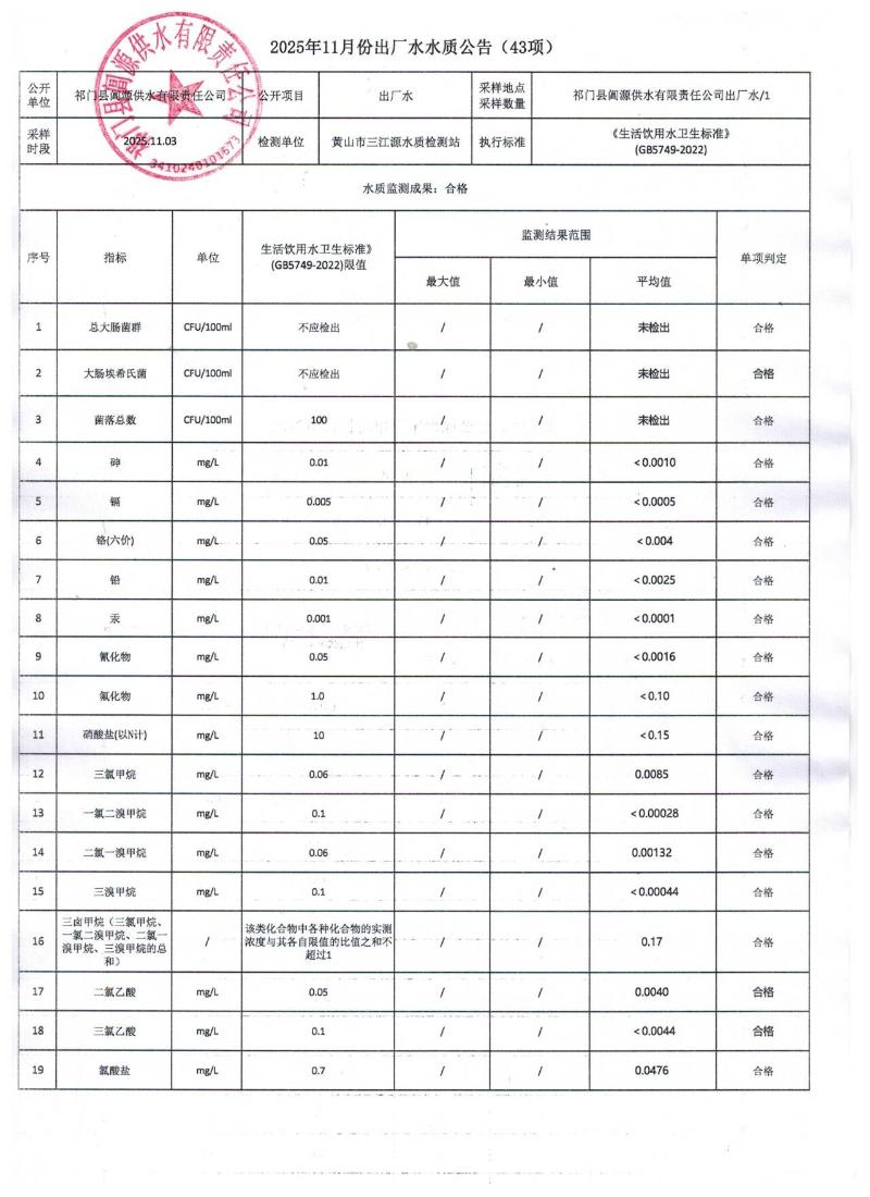 【主动回应】2025年11月份出厂水水质公告(43项)