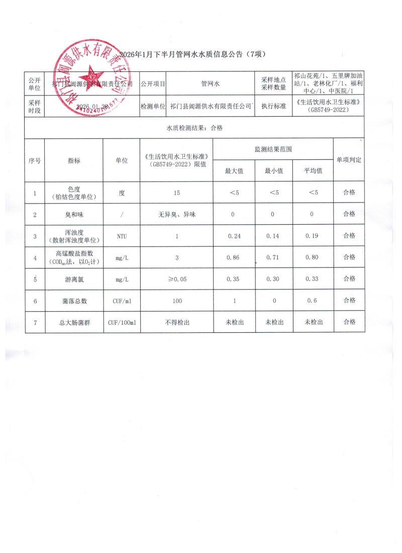 【主动回应】2026年1月下半月管网水水质信息公告(7项)