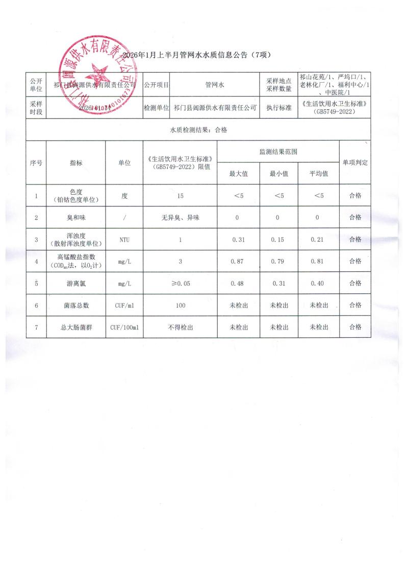 【主动回应】2026年1月上半月管网水水质信息公告(7项)