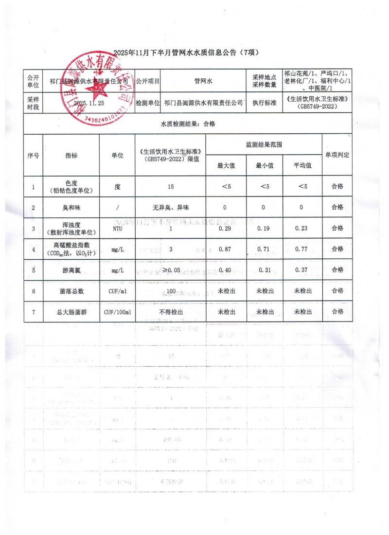 【主动回应】2025年11月下半月管网水水质信息公告(7项)