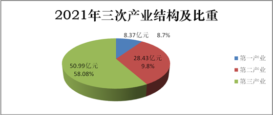 一、综合情况解析:2021年,全县实现地区生产总值877978万元,按可比价格计算,增长9.1%。其中,第一产业增加值83733万元,增长8.7%;第二产业增加值284344万元,增长9.8%;第三产业增加值509900万元,增长8.7%。三次产业比重调整为9.5:32.4:58.1。按户籍人口计算,人均地区生产总值47175元,比上年增加了5586元。