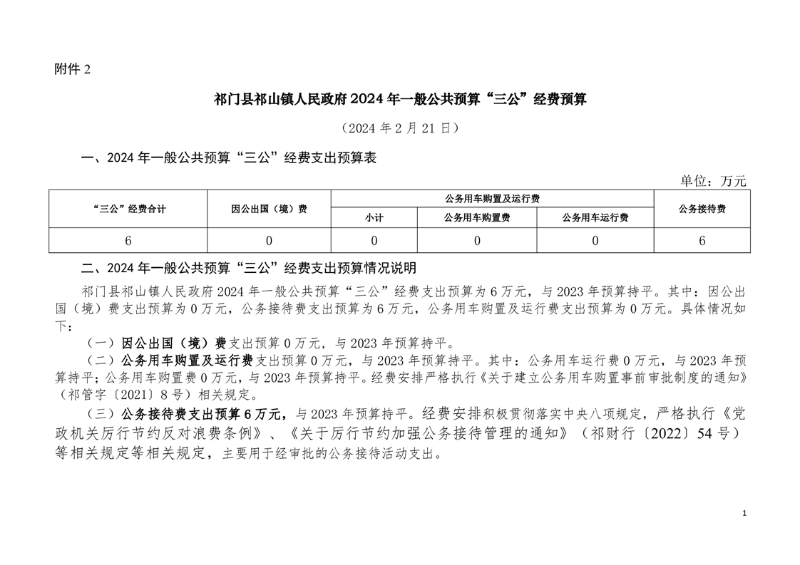 祁门县祁山镇人民政府2024年一般公共预算“三公”经费预算