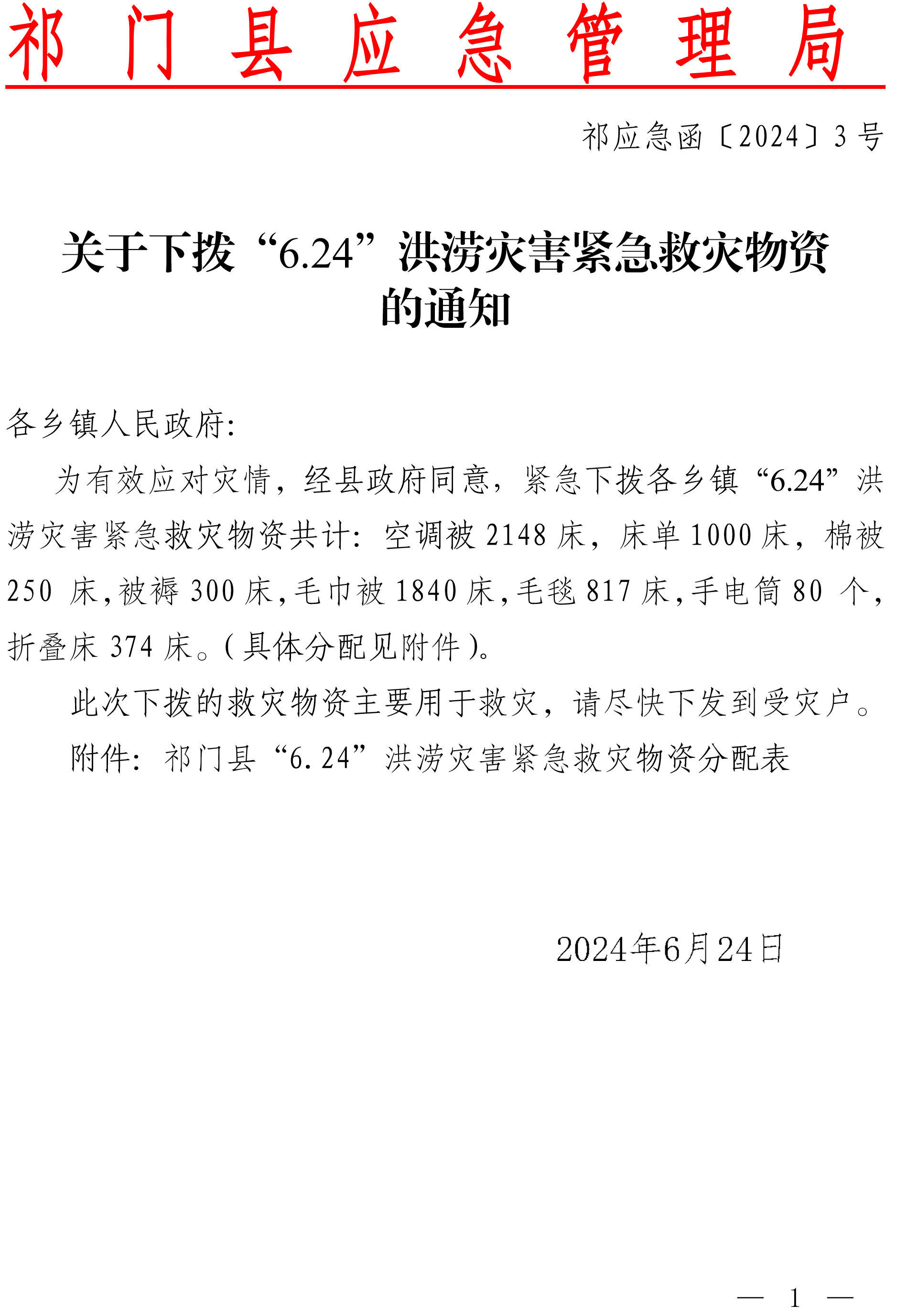 关于下拨“6.24”洪涝灾害紧急救灾物资的通知