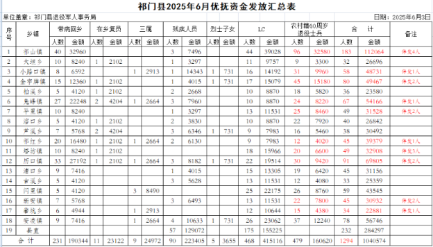 祁门县2025年6月优抚资金发放汇总表