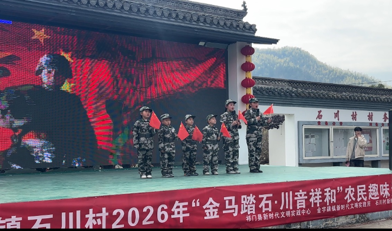 下午一时,活动准时开始。活动第一阶段为文艺演出。金字牌镇党委副书记、镇长胡雁彬首先致开幕词,他向全体村民致以亲切问候,并预祝运动会圆满成功。随后石川村党总支书记徐爱民发表讲话,感谢镇党委政府的支持与村民的积极参与。紧接着,丰富多彩的文艺节目轮番登场。村文艺队的广场舞《祖国你好》舞出了对祖国的深情祝福;镇干部朱旭演唱的《至少还有你》赢得阵阵掌声。演出间隙还穿插了反电诈和交通安全知识宣传与有奖问答,台上台下互动频繁,在娱乐中普及了重要知识。徐子恒小朋友讲述的《中国民间故事》童趣盎然,陈玉梅、许华的曳步舞串烧活力四射,最后由石川村小朋友们演唱的《强军战歌》铿锵有力,将文艺演出的气氛推向高潮。