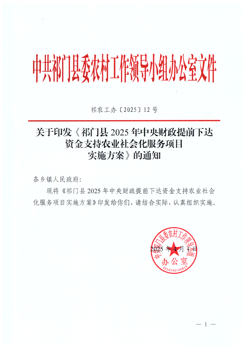 关于印发《祁门县2025年中央财政提前下达资金支持农业社会化服务项目实施方案》的通知