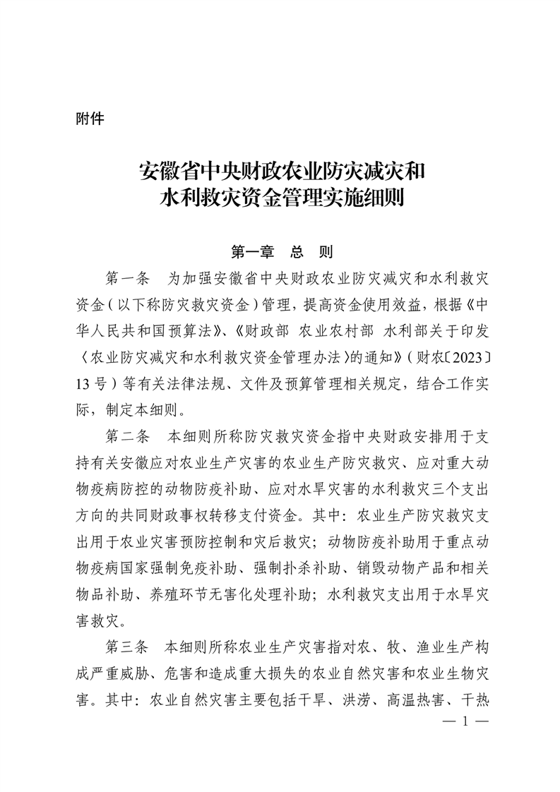 安徽省中央财政农业防灾减灾和水利救灾资金管理实施细则