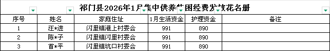 闪里镇2026年1月农村五保供养补助资金发放情况