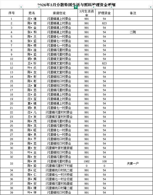 闪里镇2026年3月农村五保供养补助资金发放情况
