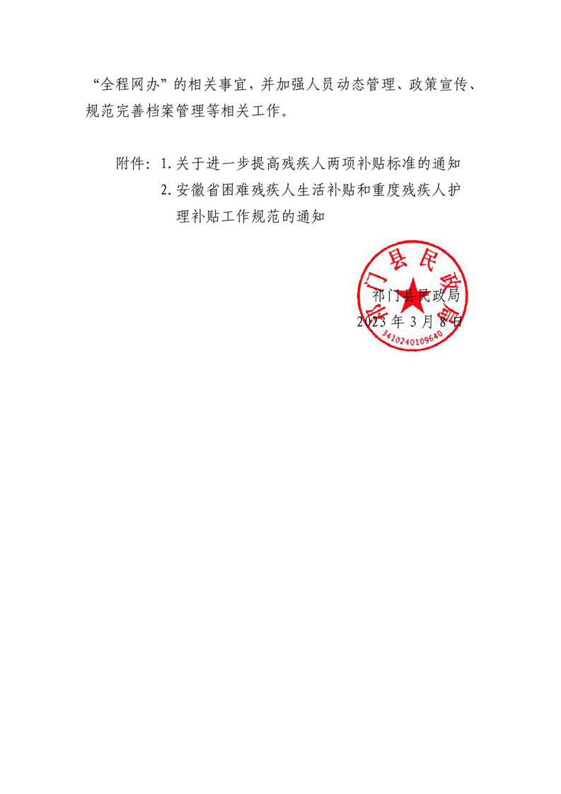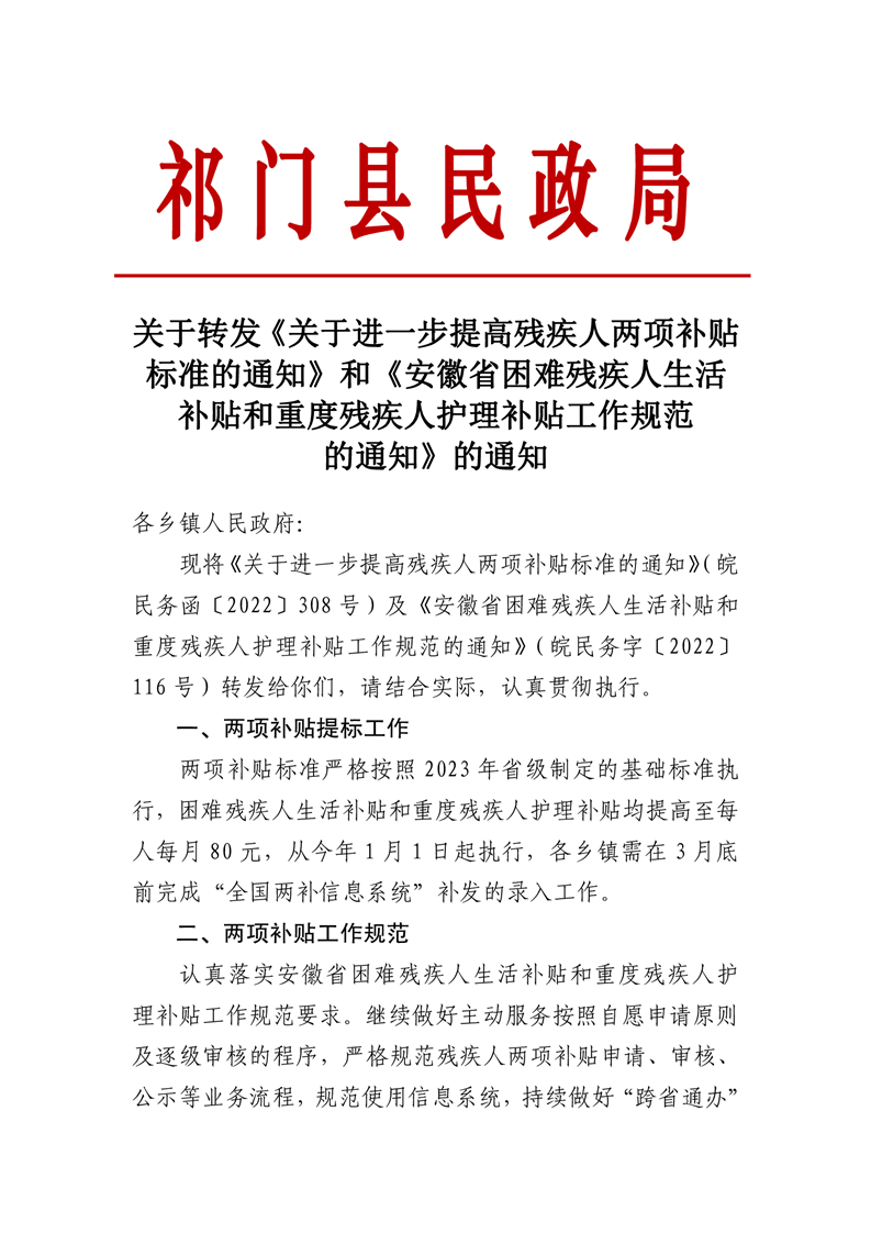 关于转发关于进一步提高残疾人两项补贴标准和安徽省困难残疾人生活补贴和护理补贴工作规范的通知