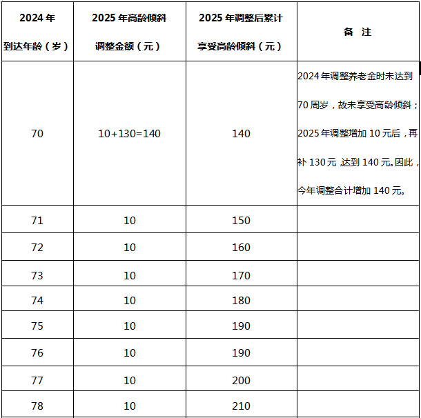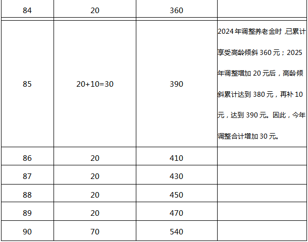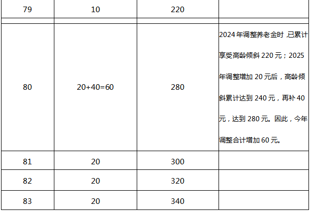 答:截至2024年12月31日,年满70-79周岁的退休人员每人每月增加10元,年满80-89周岁的退休人员每人每月增加20元,年满90周岁及以上的退休人员每人每月增加70元。其中,对2024年到达70周岁、80周岁、85周岁的退休人员,按照上述办法倾斜调整后,累计享受高龄倾斜部分低于140元、280元、390元的予以补齐。具体倾斜标准见下表: