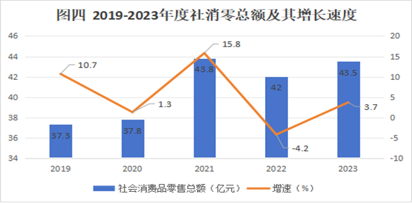 全年实现社会消费品零售总额435053万元,同比增长3.7%。其中,限额以上消费品零售额29668万元,下降12.8%。按经营地统计,城镇实现零售额264907万元,增长3.3%,乡村实现零售额170145万元,增长4.4%。按消费形态分,餐饮收入37887万元,增长8.1%,商品零售397166万元,增长3.3%。