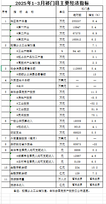 2025年1-3月祁门县主要经济指标