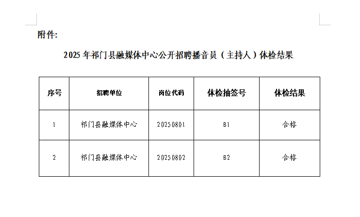 附件:2025年祁门县融媒体中心公开招聘播音员(主持人)体检结果