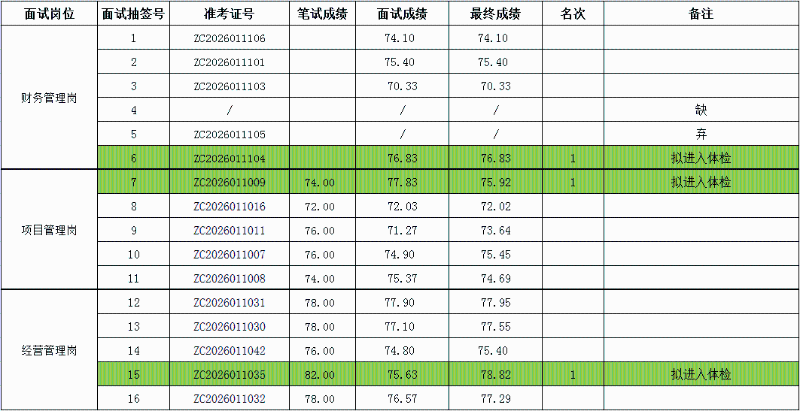 黄山市众城人力资源有限公司于2026年1月11日完成黄山市祁门县国有投资集团有限公司公开招聘工作人员的面试工作,现将最终成绩予以公布: