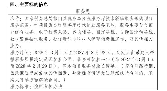 二、项目名称:国家税务总局祁门县税务局办税服务厅技术辅助服务采购项目