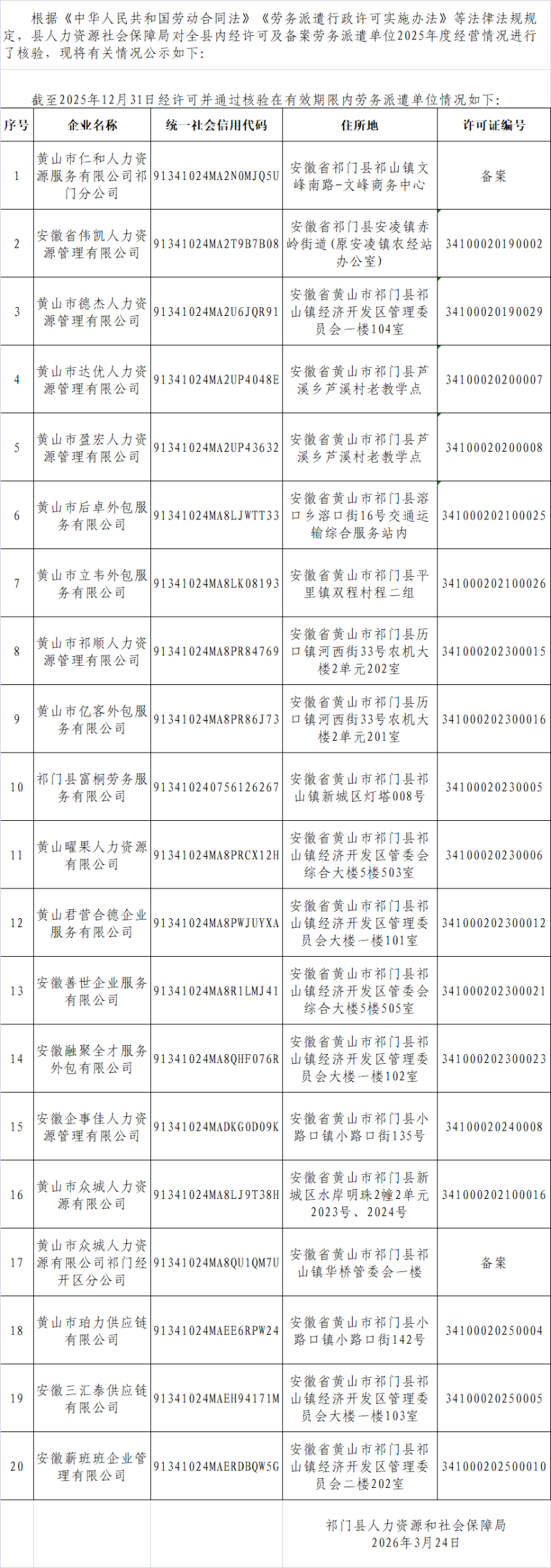 2025年度劳务派遣单位经营情况核验结果公示