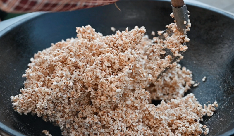 在历口镇光辉村,沈国梁一家一大早便开始忙碌起来。手工制作谷花糖要经过炒米花、熬糖、压实、切割等多道工序,过程复杂繁琐,火候与技术缺一不可,往往需要亲友邻里共同协作。