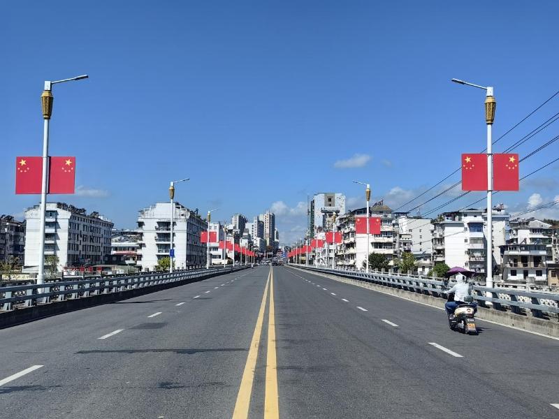 在牯牛降大道等重点路段,施工人员登上作业车,手持工具细心调试,将一面面尺寸统一、崭新整洁的国旗整齐悬挂在灯杆两侧。鲜艳的五星红旗与沿街绿植、楼宇相映,形成一道道靓丽的“红色风景线”。